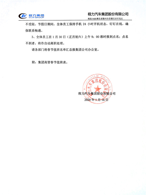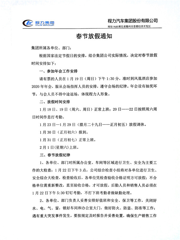 湖北程力集團(tuán)2020年春節(jié)放假通知