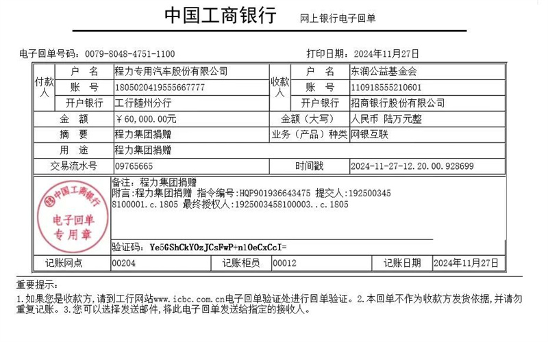 “產(chǎn)業(yè)興旺造福一方,托起千萬個夢想”、“深耕沃土實干興邦,共同富裕初心不忘”,“程力人有擔當……”,這是中國民企500強程力汽車集團股份有限公司《程力之歌》中激昂豪邁歌詞的真情流露,也是程力人勇于踐行社會公益事業(yè)的真實寫照;程力人20余年來砥礪奮進,始終把公益事業(yè)放在集團公司發(fā)展的重要位置,堅持做最有溫度最有擔當?shù)膼坌钠髽I(yè)楷模,程力人公益之路愈久彌新不遺余力,譜寫了一曲曲令人動容的新時代贊歌,那些過往的精彩畫卷仿佛蒙太奇一般呈現(xiàn)在我們眼前。 2024年11月27日,程力汽車集團旗下核心企業(yè)----程力專用汽車股份有限公司,向東潤公益基金會捐款60000元,用于弘揚公益精神和助力國家科學人才培育,以及賑災濟難、撫貧濟困、獎教助學,改善經(jīng)濟欠發(fā)達地區(qū)青少年的生活、學習條件,幫助其提高自身發(fā)展能力,為國家培養(yǎng)具有國際競爭力的新一代人才做貢獻。 這雖然只是區(qū)區(qū)6萬元愛心捐贈,但它卻是程力汽車集團二十年如一日做公益事業(yè),花費數(shù)千萬巨資中的涓涓細流,是聚溪水成滄海的重要源泉,是生命的贊歌,是無私的奉獻;是賑災濟難、扶貧濟困,獎教助學培養(yǎng)人才的大愛善舉,久久為功必成燎原之勢。 上圖:程力汽車集團承接的全國工商聯(lián)“萬企興萬村”共建鄉(xiāng)村振興對口幫扶縣----貴州省劍河縣,程力第二批捐贈消防灑水車現(xiàn)場,該縣縣委書記楊勝朝致答謝詞。