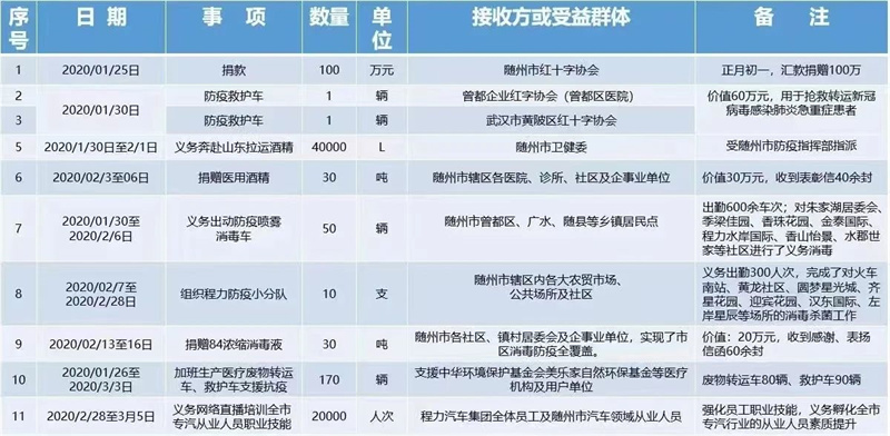 捐贈以后,雙方領導和負責任人集體合影紀念。 “躬行踐履始玉成,行而不輟終致遠”,逆光穿行回望來路,程力汽車集團于2023年,按照全國工商聯(lián)的總體部署安排,程力汽車集團幫扶的劍河縣“萬企興萬村”鄉(xiāng)村振興項目,向該縣消防大隊捐贈了第一批5輛中大型消防灑水車,程力汽車集團與劍河縣政府簽署了合作備忘錄,并提供多項幫扶措施。 程力汽車集團自2004年創(chuàng)立以來,就踐行社會責任倡導公益事業(yè),在創(chuàng)建世界一流專汽領先企業(yè)的過程中,始終如一的把“精準扶貧”、“抗疫抗洪、搶險救災”、“萬企興萬村”,以及扶危濟困、關愛孤寡老人、殘疾兒童,捐款捐物等公益事業(yè)作為回報社會的重要途徑,先后對宣恩縣巴楚風印務公司、恩施移民社區(qū),以及隨州養(yǎng)老院、殘疾孤兒院、萬店鎮(zhèn)新東村扶貧,隨縣柳林鎮(zhèn)洪災、廣水雙塘村鄉(xiāng)村振興,抗疫捐款捐物、河南鄭州洪災、甘肅積石山地震、河北涿州水災、湖南岳陽潰壩搶險,都給予援助救急解困,累計投入數(shù)千萬公益資金。 一路走來,程力在公益事業(yè)得到了黨委政府的嘉獎表揚,現(xiàn)部分擇錄如下以饗讀者:從“千企幫千村”到“萬企幫萬村”,再到“萬企興萬村”,以及從精準扶貧到扶危濟困,從抗疫到抗洪、地震救援,程力人無一不沖鋒在前沿,堅持不懈的奮斗在公益事業(yè)第一線。