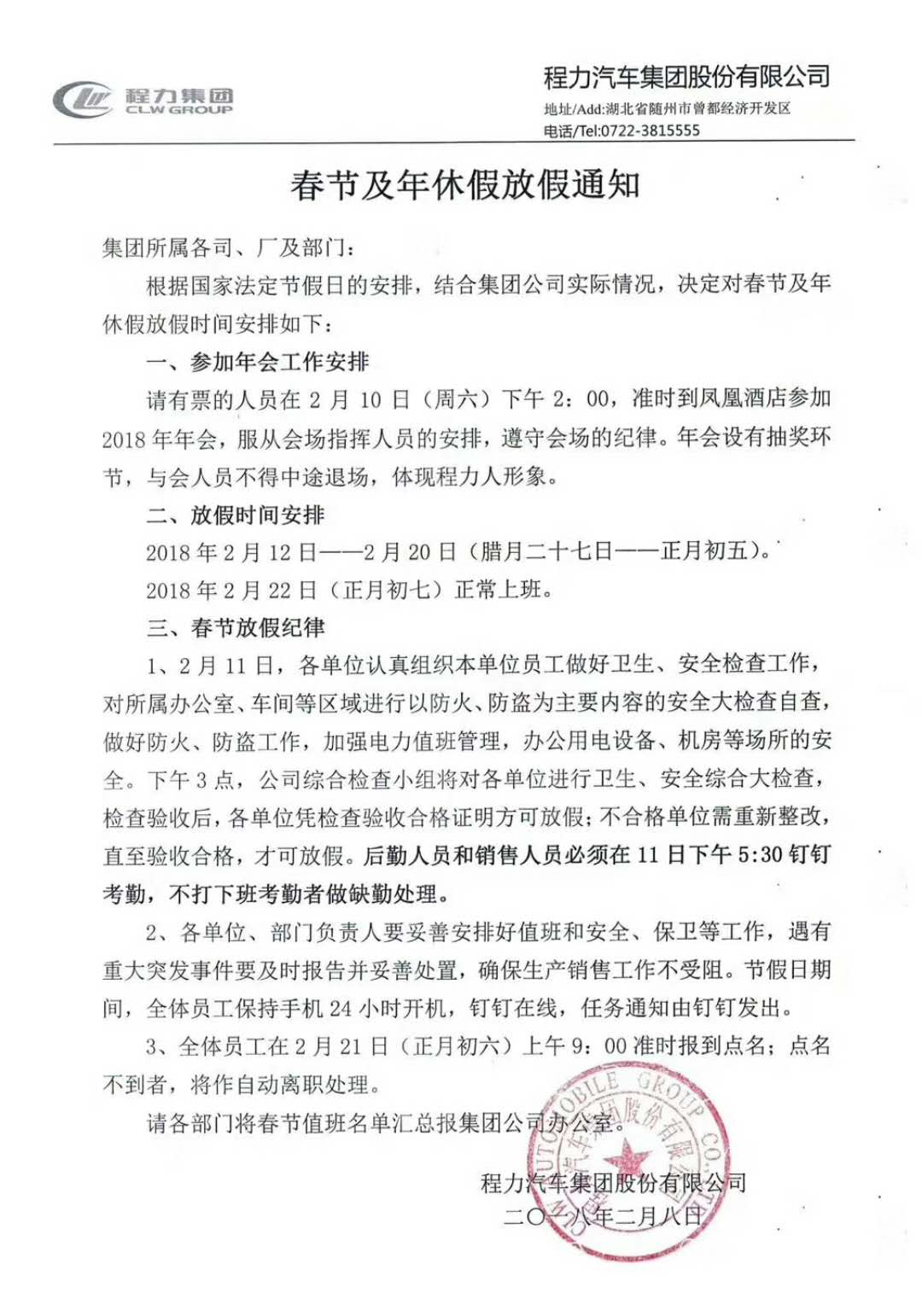 湖北程力汽車集團(tuán)股份有限公司2018年春節(jié)及年休假放假通知
