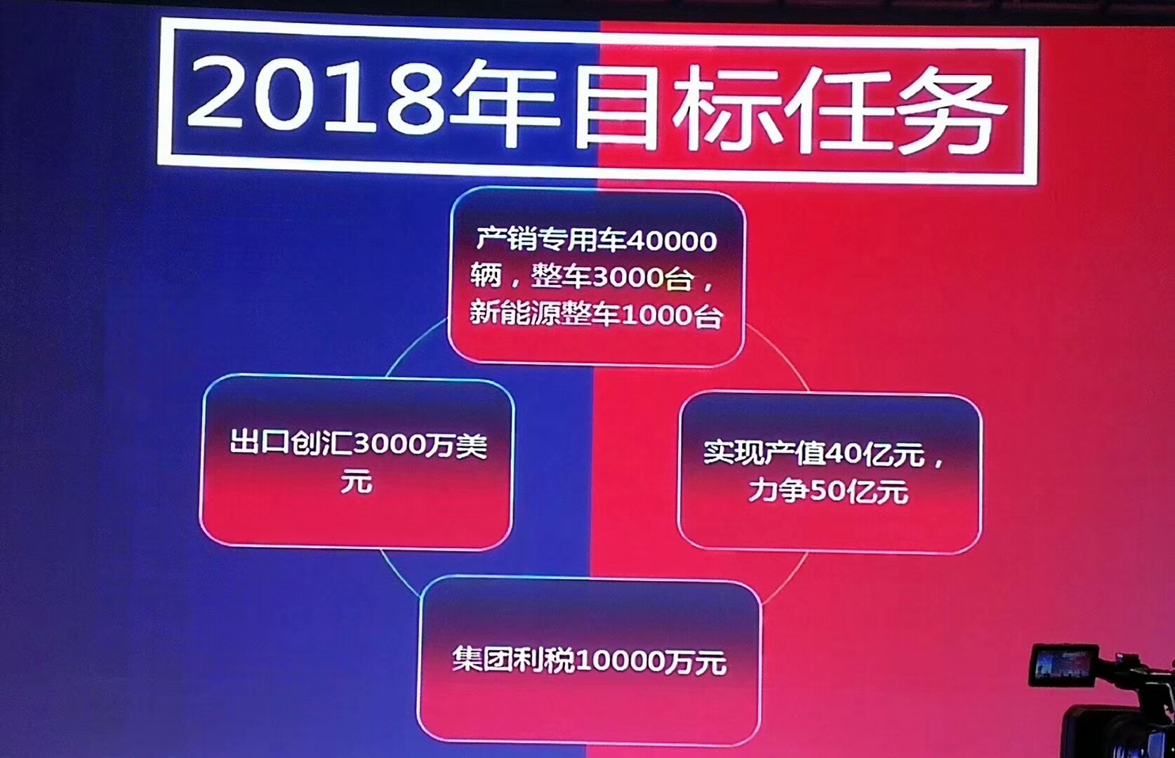 四、2018年目標(biāo)任務(wù):產(chǎn)銷專用車40000輛,整車3000臺,新能源整車1000臺,實現(xiàn)產(chǎn)值40億元,力爭50億元 |