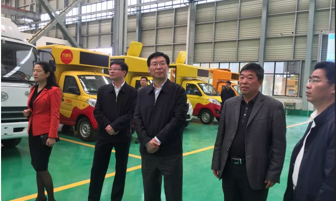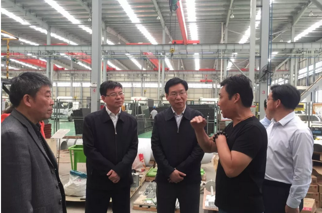 (圖一:各位領(lǐng)導(dǎo)來到宣傳車車間視察,左邊至右邊依次為萬副區(qū)長、曾區(qū)長、梁副主席、程力重工常務(wù)副總李會成、祁家灣街道張主任)