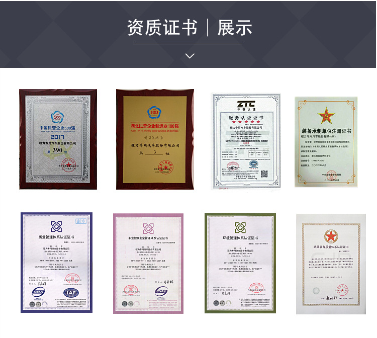 多樣│滿足各種專汽需求 專用車產(chǎn)業(yè)細(xì)分產(chǎn)品眾多,每個(gè)產(chǎn)品的市場格局由于行業(yè)門檻和市場特征的不同具有較大差異。隨著高等級公路的建設(shè)、物流市場的逐漸成熟,以及國內(nèi)大量基礎(chǔ)設(shè)施建設(shè),專用汽車產(chǎn)品結(jié)構(gòu)較過去有了很大變化,重型車和輕型車比例處于增長趨勢,中型車比例繼續(xù)下降;體現(xiàn)專用功能特性的產(chǎn)品比重加大;種數(shù)得到大幅增加,產(chǎn)品結(jié)構(gòu)更加合理。 程力主要產(chǎn)品包括灑水車、加油車、冷藏車、油罐車、垃圾車、吸污車、道路清掃車、高壓清洗車、高空作業(yè)車等八大系列100多個(gè)品種車型及其相關(guān)專用汽車配件,技術(shù)力量雄厚、檢測手段完備,擁有大型設(shè)備750臺(tái)(套)及16條總裝生產(chǎn)線。 產(chǎn)品質(zhì)量穩(wěn)定,經(jīng)營方式靈活,公司現(xiàn)已全面通過ISO9001-2008 國際質(zhì)量體系認(rèn)證、3C國際強(qiáng)制產(chǎn)品認(rèn)證,并通過出口產(chǎn)品的各項(xiàng)認(rèn)證。“程力威”產(chǎn)品有680多個(gè)品種上國家公告目錄,其中有不少的車型如灑水車、垃圾車、吸污車、吸糞車等環(huán)衛(wèi)系列車型享受國家免車輛購置稅優(yōu)惠條件。