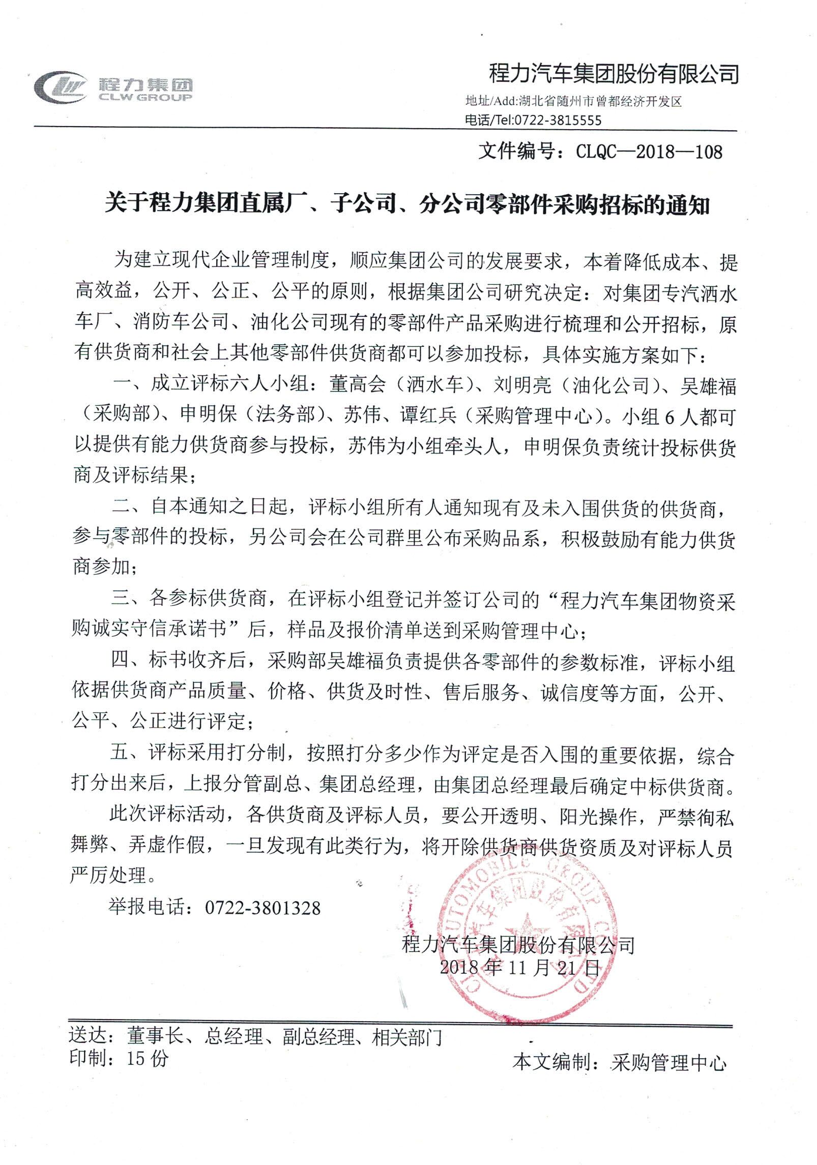 關(guān)于湖北程力汽車所有零部件招投標(biāo)活動(dòng)公示: 湖北程力公司正在進(jìn)行所有程力公司所用的所有零部件及配套件(含所有的灑水車、環(huán)衛(wèi)車、化工車、消防車、罐式車等)招投標(biāo)活動(dòng),我們需要供應(yīng)商或從事此方面的專業(yè)人員踴躍投標(biāo),公司對(duì)所有的供應(yīng)商一視同仁、不偏不倚,嚴(yán)格按照公開、公正、公平原則進(jìn)行招投標(biāo)工作,所有投標(biāo)人員只要性價(jià)比合理均有可能會(huì)中標(biāo),請(qǐng)公司各位員工積極介紹認(rèn)識(shí)的相關(guān)能配套的人員或公司投標(biāo)。 |