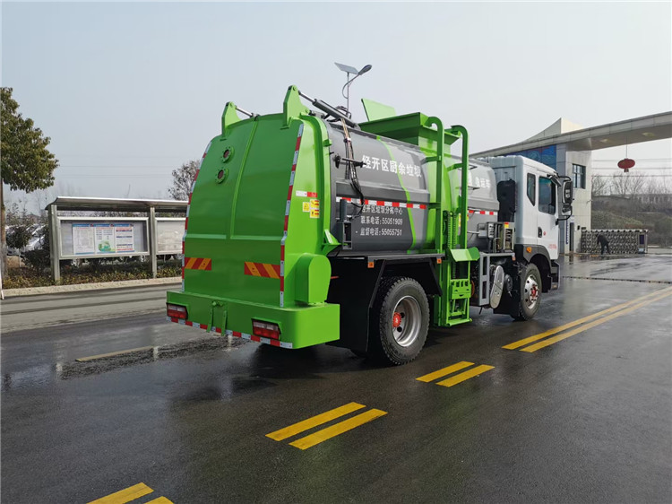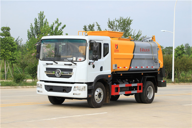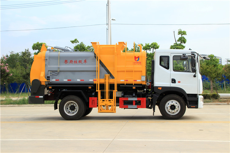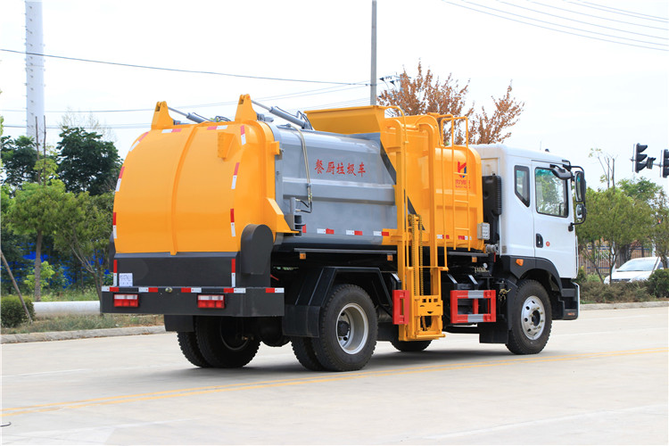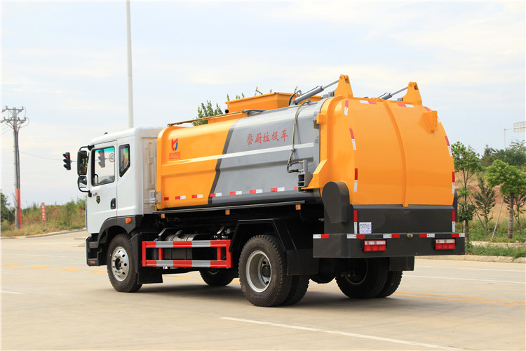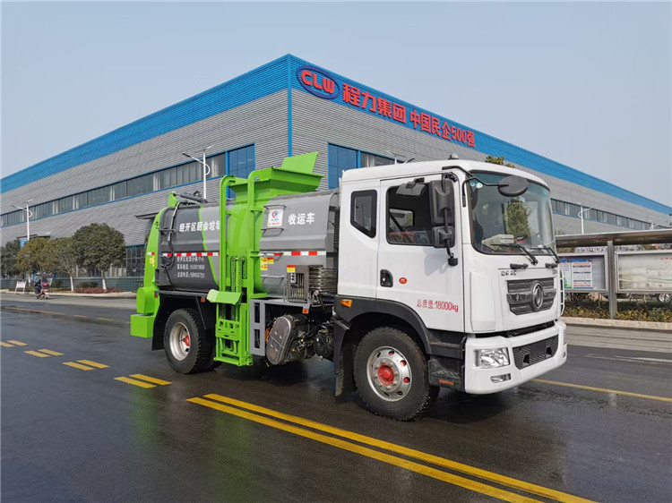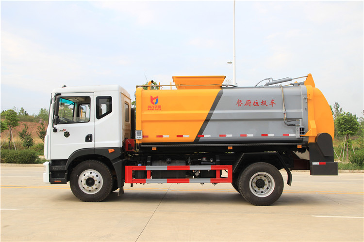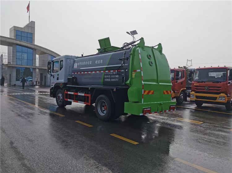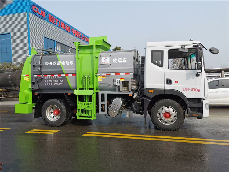 東風(fēng)多利卡D9國(guó)六10方餐廚垃圾車(chē)底盤(pán)配置:采用東風(fēng)D9系列新款駕駛室,4500mm軸距,搭載國(guó)六(國(guó)Ⅵ)玉柴200匹馬力/康明斯230柴油發(fā)動(dòng)機(jī),法士特8檔變速箱,9T后橋,10.00R20鋼絲胎,ABS,標(biāo)配電動(dòng)窗、中控鎖、鑰匙、日間行車(chē)燈、自動(dòng)落鎖、斷氣剎、定速巡航、瞬時(shí)油耗,科技感十足,駕乘更舒適,GB7258新規(guī)。 東風(fēng)多利卡D9國(guó)六10方餐廚垃圾車(chē)上裝配置:罐體容積10方,采用4mm碳鋼制作,圓距形罐體,液壓系統(tǒng),配拉桿式提升機(jī),可掛120/240升垃圾桶,推鏟卸料,具有干濕分離,罐體尾門(mén)液壓打開(kāi)和鎖緊+手動(dòng)鎖緊裝置,罐尾設(shè)液體自流閥,液位窗,后門(mén)液壓開(kāi)啟。用于運(yùn)輸液態(tài)垃圾,其特點(diǎn)操作簡(jiǎn)單,密封性好,無(wú)泄漏,無(wú)異味,常用于餐館的垃圾轉(zhuǎn)運(yùn)處理。 此款環(huán)衛(wèi)垃圾車(chē)可加裝配置:1、罐體內(nèi)部固液分離功能(全推推板,不銹鋼泔水分離網(wǎng)板);2、罐內(nèi)加熱功能(用于嚴(yán)寒地帶防止罐內(nèi)餐飲垃圾凍結(jié)凝固,采用柴油燃燒機(jī)加熱,加熱速度快效果好,可設(shè)置高低溫實(shí)現(xiàn)自動(dòng)溫控);3、稱(chēng)重功能(垃圾桶提升架稱(chēng)重計(jì)量);4、罐體清洗裝置(加裝高壓泵與高壓水槍?zhuān)?、吸污功能(利用真空吸污裝置直接將餐飲垃圾吸入罐體)