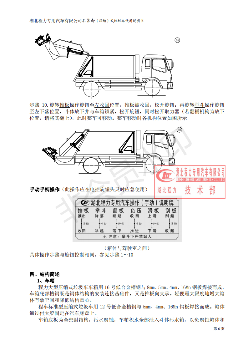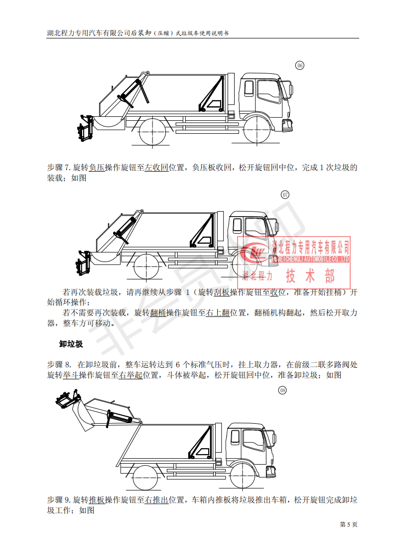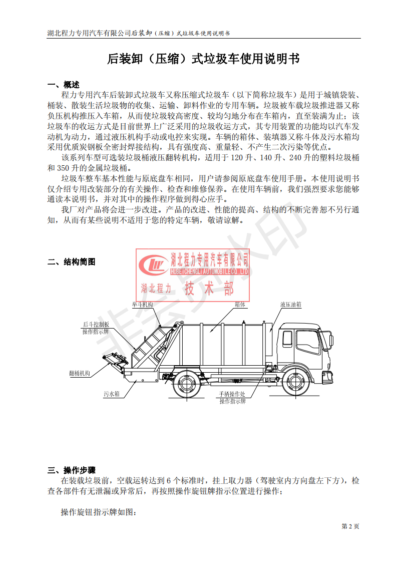 湖北程力壓縮式垃圾車:采用機(jī)電液一體化技術(shù),采用機(jī)、電、液聯(lián)合自動(dòng)控制系統(tǒng),通過車廂、填裝器、推鏟等專用裝置,實(shí)現(xiàn)垃圾裝入、壓碎或壓扁、強(qiáng)力裝填,最后將垃圾壓實(shí)擠入車廂,運(yùn)到目的地進(jìn)行自動(dòng)推動(dòng)卸載。其突出特點(diǎn):垃圾收集方式簡(jiǎn)便、高效、具有反復(fù)壓縮及蠕動(dòng)壓縮等功能,壓縮比高,裝載質(zhì)量大,作業(yè)自動(dòng)化,動(dòng)力性、環(huán)保性好,整車?yán)眯矢摺?/span> 湖北程力壓縮垃圾車為全密封型,壓縮過程中的污水直接進(jìn)入污水廂,徹底解決垃圾運(yùn)輸過程中的二次污染,關(guān)鍵部件選用進(jìn)口部件。 帶掛桶提升架,可配套使用全國(guó)通用鐵制掛桶或塑料掛桶、強(qiáng)力裝填,把垃圾推擠入車廂并壓實(shí)和推卸。 環(huán)保系列——壓縮垃圾車簡(jiǎn)介,如下所示: 湖北程力壓縮垃圾車由密封式垃圾廂、液壓系統(tǒng)、操作系統(tǒng)組成。壓縮垃圾車整車為全密封型,自行壓縮、自行傾倒、壓縮過程中的污水全部進(jìn)入污水廂,較為徹底的解決了壓縮車運(yùn)輸過程中的二次污染的問題,關(guān)鍵部件采用進(jìn)口部件,具有壓力大、密封性好、操作方便、安全等優(yōu)點(diǎn)。 1、翻轉(zhuǎn)機(jī)構(gòu):裝配帶垃圾桶(或垃圾斗)的翻轉(zhuǎn)機(jī)構(gòu);使垃圾收集傾倒更方便。 2、垃圾收集方式簡(jiǎn)便:一改城市滿街?jǐn)[放垃圾筒的臟亂舊貌,杜絕二次污染。 3、壓縮比高、裝載量大:最大破碎壓力達(dá)12噸,裝載量相當(dāng)于同噸級(jí)排非壓縮垃圾的兩倍半。 4、作業(yè)自動(dòng)化:采用進(jìn)口電腦控制系統(tǒng),全部填裝排卸作業(yè)中需司機(jī)一人操作,不僅減輕環(huán)衛(wèi)工人的勞動(dòng)強(qiáng)度,而且大大改善了工作環(huán)境。 5、經(jīng)濟(jì)性好:專用設(shè)備工作時(shí),電腦控制系統(tǒng)自動(dòng)控制油門。 6、雙保險(xiǎn)系統(tǒng):作業(yè)系統(tǒng)具有電腦控制和手動(dòng)操縱雙重功能,大大地保障和提高車輛的使用率。 7、密封性能:實(shí)現(xiàn)收、運(yùn)過程中無垃圾滲漏,有效防止二次污染。 ![]() ![]() ![]() ![]() ![]() ![]() ![]() ![]() ![]() ![]() ![]() |