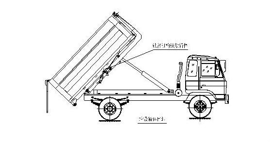 完成垃圾箱體的上車工作,松開(kāi)取力器,整車可以運(yùn)輸行駛。 步驟5. 在卸垃圾前,整車運(yùn)轉(zhuǎn)達(dá)到6個(gè)標(biāo)準(zhǔn)氣壓時(shí)掛上取力器,打開(kāi)垃圾箱后門鎖緊裝置,在前級(jí)二聯(lián)多路閥處,首先確定鎖緊架鎖緊垃圾箱體(拉起鎖緊鉤操作手柄至鎖緊位置),然后拉起拉臂操作手柄至伸出位置,垃圾箱體備傾斜舉起垃圾卸出;如圖: