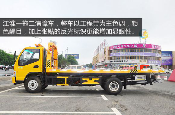 江淮平板一拖二清障車,整車以工程黃為主色調(diào),顏色醒目,加上張貼的反光標(biāo)識(shí)更能增加顯眼性,(如圖,在閃光燈的拍攝下反光出的效果)即使在北方冬季大雪的情況下,也能顯示出顯眼性,充分的保障了行車的安全性。