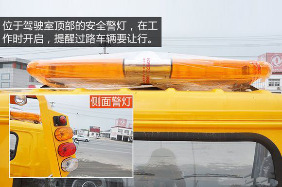 位于駕駛室頂部的安全警燈,在工作時(shí)開啟,提醒過路車輛要讓行,另外平板上方的架子左右各加裝有長(zhǎng)排24V電子安全警示燈,進(jìn)一步的加強(qiáng)了安全性。