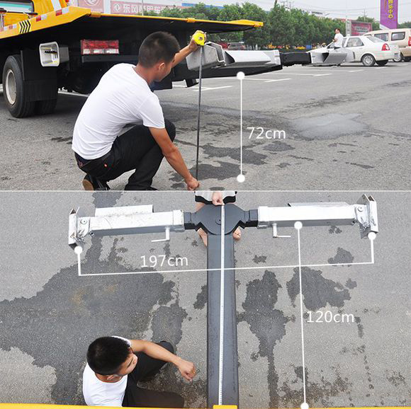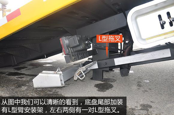 從圖中我們可以清晰的看到,底盤尾部加裝有L型臂安裝架,左右兩側(cè)有一對(duì)L型拖叉,其作用主要是托舉車輛時(shí),能抱緊輪胎,防止輪胎滑落。
