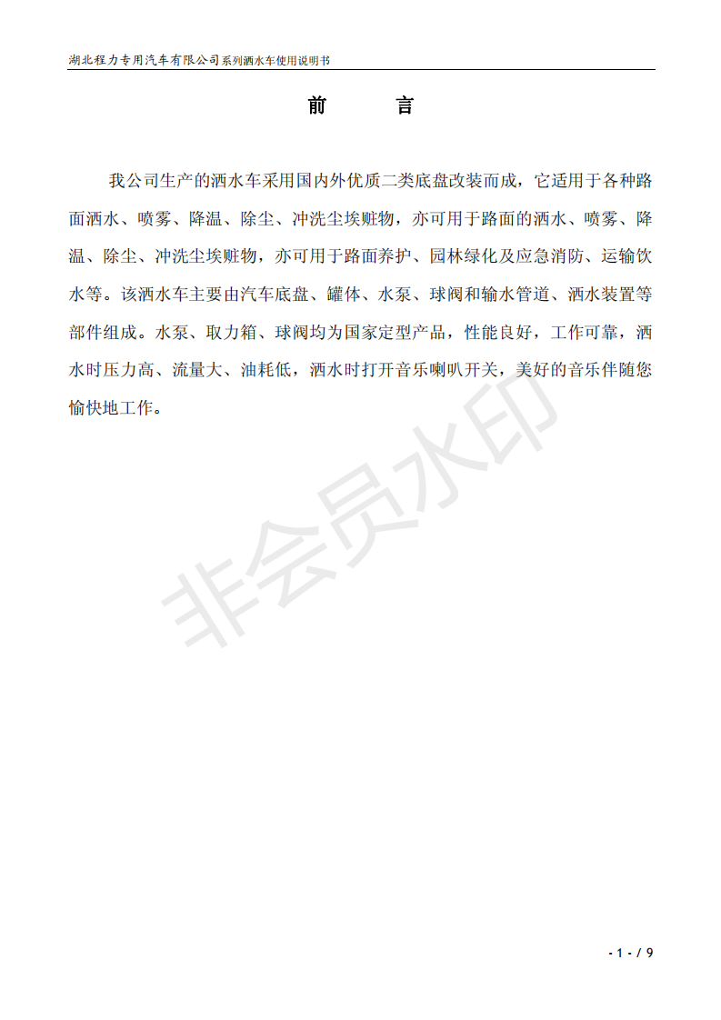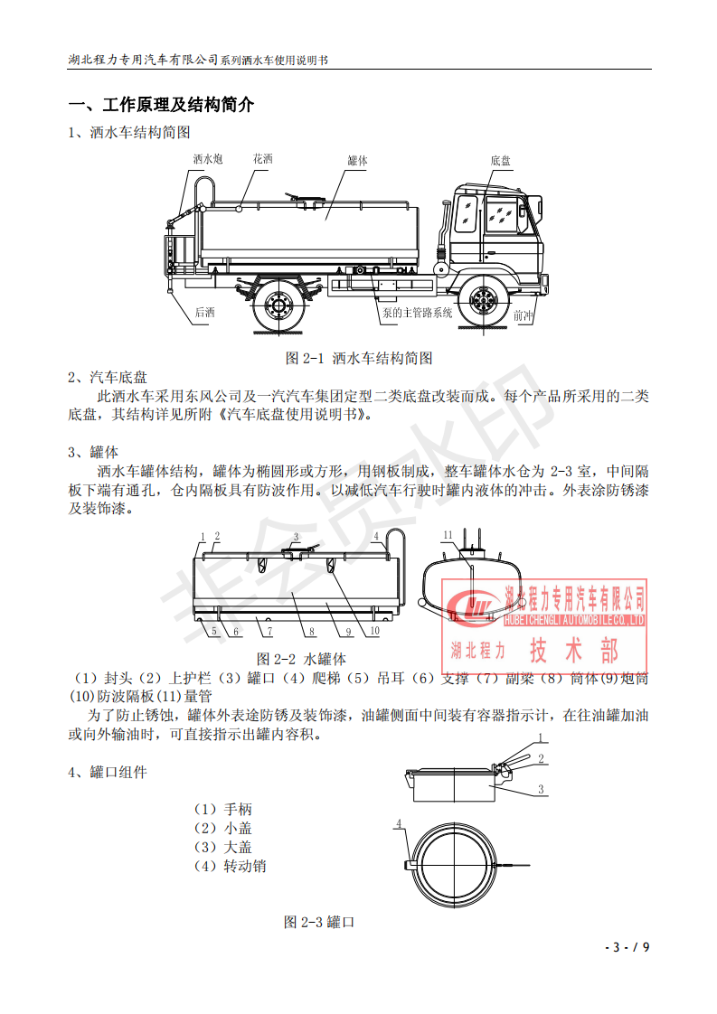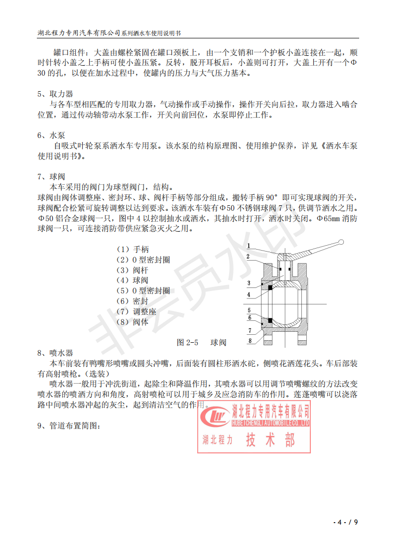 湖北程力專業(yè)生產(chǎn)東風(fēng)小霸王灑水車、東風(fēng)多利卡灑水車、東風(fēng)灑水車、東風(fēng)大金剛灑水車、東風(fēng)140灑水車、東風(fēng)140/47灑水車、東風(fēng)145灑水車、東風(fēng)153灑水車、東風(fēng)1254灑水車、東風(fēng)前四后八灑水車、東風(fēng)天龍灑水車、半掛灑水車、解放系列灑水車、汽油灑水車等各類灑水車。用戶可自帶底盤我廠提供上裝部件的生產(chǎn)改裝。 灑水車前沖(噴)后灑,帶側(cè)噴,罐體后帶工作平臺,平臺上安裝綠化灑水炮,灑水炮可全方位旋轉(zhuǎn),可連續(xù)調(diào)成直沖狀、大雨、小雨、毛毛雨,帶安全護欄,配備全國質(zhì)量評比第一名的杭州威龍大功率專用灑水泵,泵可自吸自排,安裝過濾網(wǎng),帶消防接口,可通過消防栓進水,帶自流閥,隨車選裝20米綠化卷盤,可噴灑農(nóng)藥,罐體金屬漆。 灑水泵情況說明:大功率專用灑水泵,采用國際領(lǐng)先意大利技術(shù),在國內(nèi)生產(chǎn)各系列專用泵已有50年歷史,產(chǎn)品質(zhì)量成熟可靠,設(shè)計先進合理,使用方便快捷,比同類灑水泵壓力大、吸程遠、使用壽命長,克服其它灑水泵易被雜物纏住、壓力小、吸水慢的缺點,引領(lǐng)國內(nèi)外灑水泵行業(yè)標(biāo)準(zhǔn),市場占有率93%。關(guān)于湖北程力灑水車使用說明書介紹如下,用戶不清楚可以直接打印出來。 ![]() ![]() ![]() ![]() ![]() ![]() ![]() ![]() ![]() |