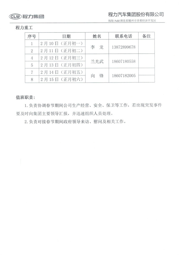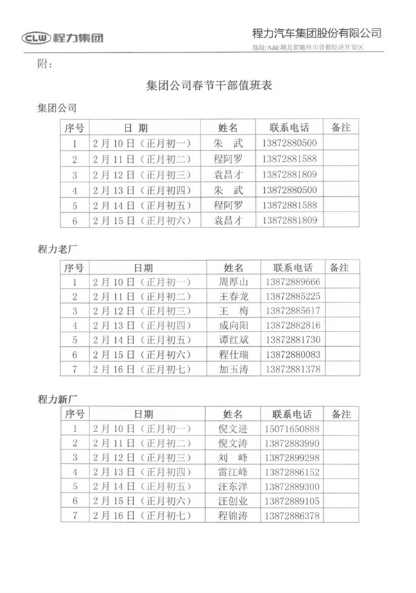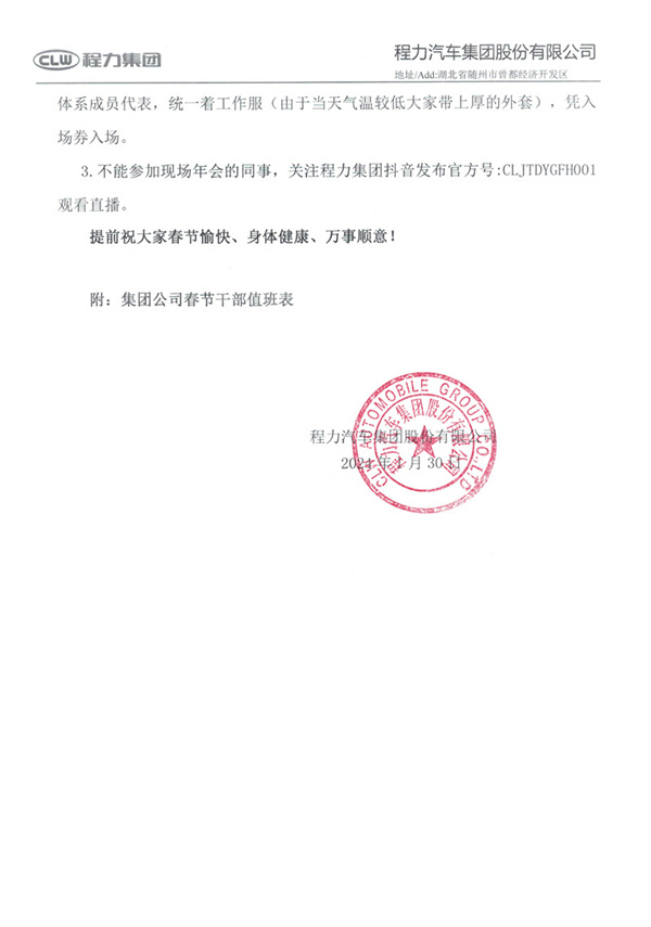 程力汽車集團(tuán)股份有限公司關(guān)于2024年春節(jié)放假的時(shí)間及“凝心聚力謀發(fā)展奮發(fā)有為奔 一流”網(wǎng)絡(luò)直播年會(huì)暨總結(jié)表彰大會(huì)的通知 程力集團(tuán)公司全體員工: 根據(jù)國(guó)務(wù)院辦公廳2024年放假有關(guān)規(guī)定,現(xiàn)將程力汽車集團(tuán)公司2024年春節(jié)放假安排通知如下: 一、2024年春節(jié)放假時(shí)間 2月7日--2月8日按星期六、日作息時(shí)間上班; 2月9日各子公司、職能部門根據(jù)工作需要安排人員值班; 2月10日(正月初一)一-2月15日(正月初六)放假,共六天。 二、2024年春節(jié)放假工作安排及相關(guān)要求 1.各單位、部門要做好節(jié)前安全檢查和清潔掃除工作,集團(tuán)綜合檢查組將對(duì) 新老廠區(qū)辦公室、生產(chǎn)車間等區(qū)域進(jìn)行安全大檢查。 2.節(jié)假日期間若遇突發(fā)事件發(fā)生,要妥善處置并及時(shí)報(bào)告;全體員工須保持手機(jī)開機(jī)狀態(tài),釘釘在線,確保聯(lián)系暢通。 3.全體員工請(qǐng)于2月16日(正月初七)上午9:00準(zhǔn)時(shí)報(bào)到,2月17日(正月初八)正式上班,無故未到者,將作自動(dòng)離職處理。 4.公司倡導(dǎo)廣大員工春節(jié)期間加強(qiáng)個(gè)人防護(hù),共同度過一個(gè)平安祥和的春節(jié)! 三、召開網(wǎng)絡(luò)直播年會(huì)暨總結(jié)表彰大會(huì)時(shí)間及相關(guān)要求 1.于2024年2月4日(臘月二十五)上午9:18分整在老廠6號(hào)樓2樓會(huì) 議室召開,請(qǐng)參會(huì)人員于8:50前進(jìn)場(chǎng),年會(huì)以線上+線下模式舉行。 2.請(qǐng)收到年會(huì)現(xiàn)場(chǎng)入場(chǎng)券的集團(tuán)中高層、五大生產(chǎn)體系成員代表、十大銷售體系成員代表,統(tǒng)一著工作服(由于當(dāng)天氣溫較低大家?guī)虾竦耐馓?,憑入 場(chǎng)券入場(chǎng)。 3.不能參加現(xiàn)場(chǎng)年會(huì)的同事,關(guān)注程力集團(tuán)抖音發(fā)布官方號(hào):CLJTDYGFH001 觀看直播。 提前祝大家春節(jié)愉快、身體健康、萬事順意!附圖: ![]() ![]() ![]() ![]() |
