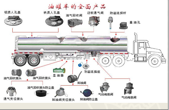 (1)海底閥:又稱緊急切斷閥,安裝于罐體底部,進行下裝加油時使用,在油罐發(fā)生意外時,由于斷槽處于無法承載過大沖力,車體管路與罐體會自動斷開,而自動對中柱塞和耐用彈簧會依舊保持密封,罐內(nèi)介質(zhì)不會泄漏,從而保證油罐安全。 (2)油氣回系統(tǒng):①油氣回收閥:是將在裝卸油料時所產(chǎn)生的油氣回收的一種裝置,可以直接安裝在油罐車頂部罐體上,避免了油氣外泄。 ②油氣回收接頭:罐車油氣回收系統(tǒng)組成一個封閉的循環(huán)系統(tǒng),有效的將在油站加油過程中產(chǎn)生的油氣回收再利用,避免了油氣擴散