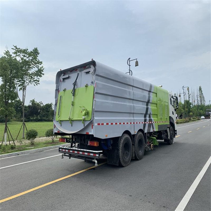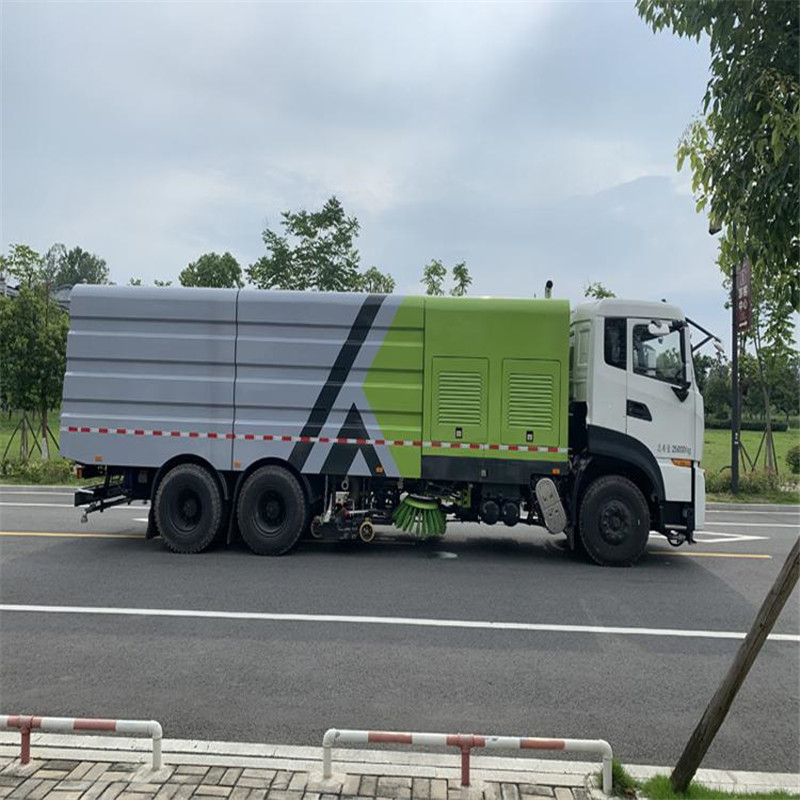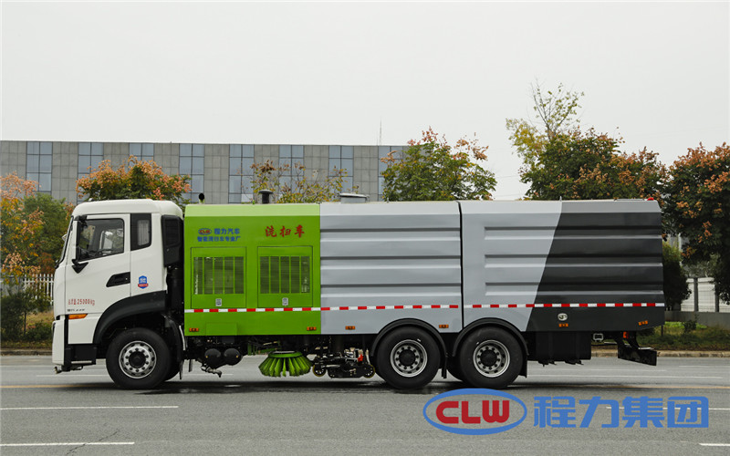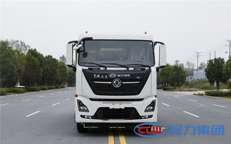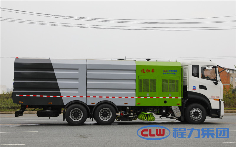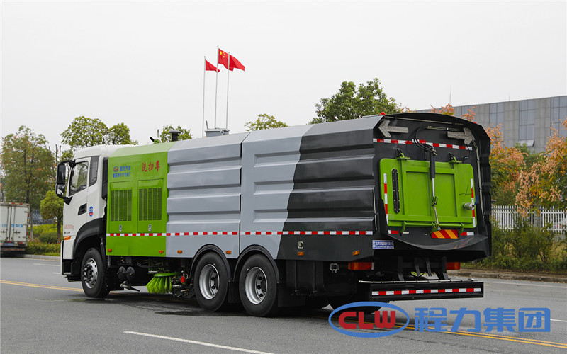 湖北程力國六東風天龍后雙橋大型洗掃采用東風天龍DFH1250D4型國Ⅵ二類汽車底盤改裝,加裝副發(fā)動機、風機、高壓水泵、清水箱、垃圾箱、左右立掃、帶噴水桿的寬吸嘴、低壓沖洗系統(tǒng)、掃盤降塵系統(tǒng)、液壓系統(tǒng)、專用裝置電控系統(tǒng)和副車架等改裝而成。